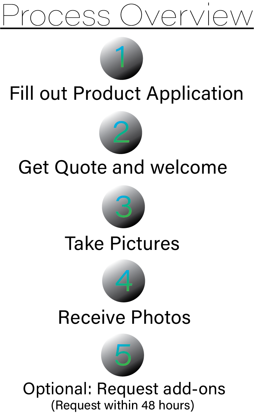 In order for me to do the product photography, the item will need to be transported or delivered to a specified location for me to pick up the item. Please indicate if you want the item returned in the contact form. Shipping is not included in this package and will need to done by the customer. Include in the contact form if you would like the item returned (to the specified location).